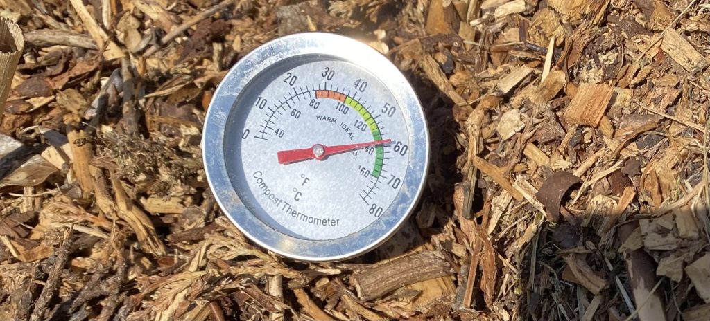 Your green waste dseposits are coming in and our first batch of compost has started cooking. Once the first heat peak has cooled, we will turn the pile into the next bay to set the process off again by re-introducing oxygen to the mix. The heat helps the material to decompose quickly, and we’re hoping to have our first compost available by the end of summer – provided we get a bit of rain!
