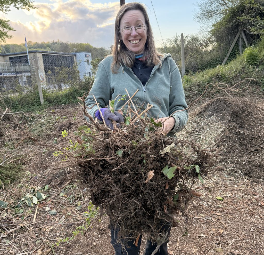 To compost a rootbound plant or rootstock, soak it first in water. Massage the roots once loose and thoroughly wash out any soil and stones, and chop it up with secateurs. Voila! Throw in your BATCOM bag and bring it down 🙂